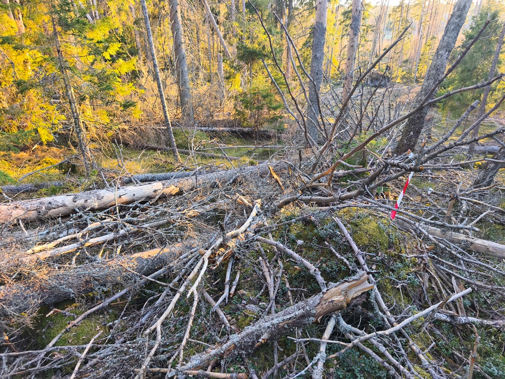 Svartbäcken är lite brötig minst sagt, här en stenkontroll som man med lite god viilja ser under nedfallna träd,